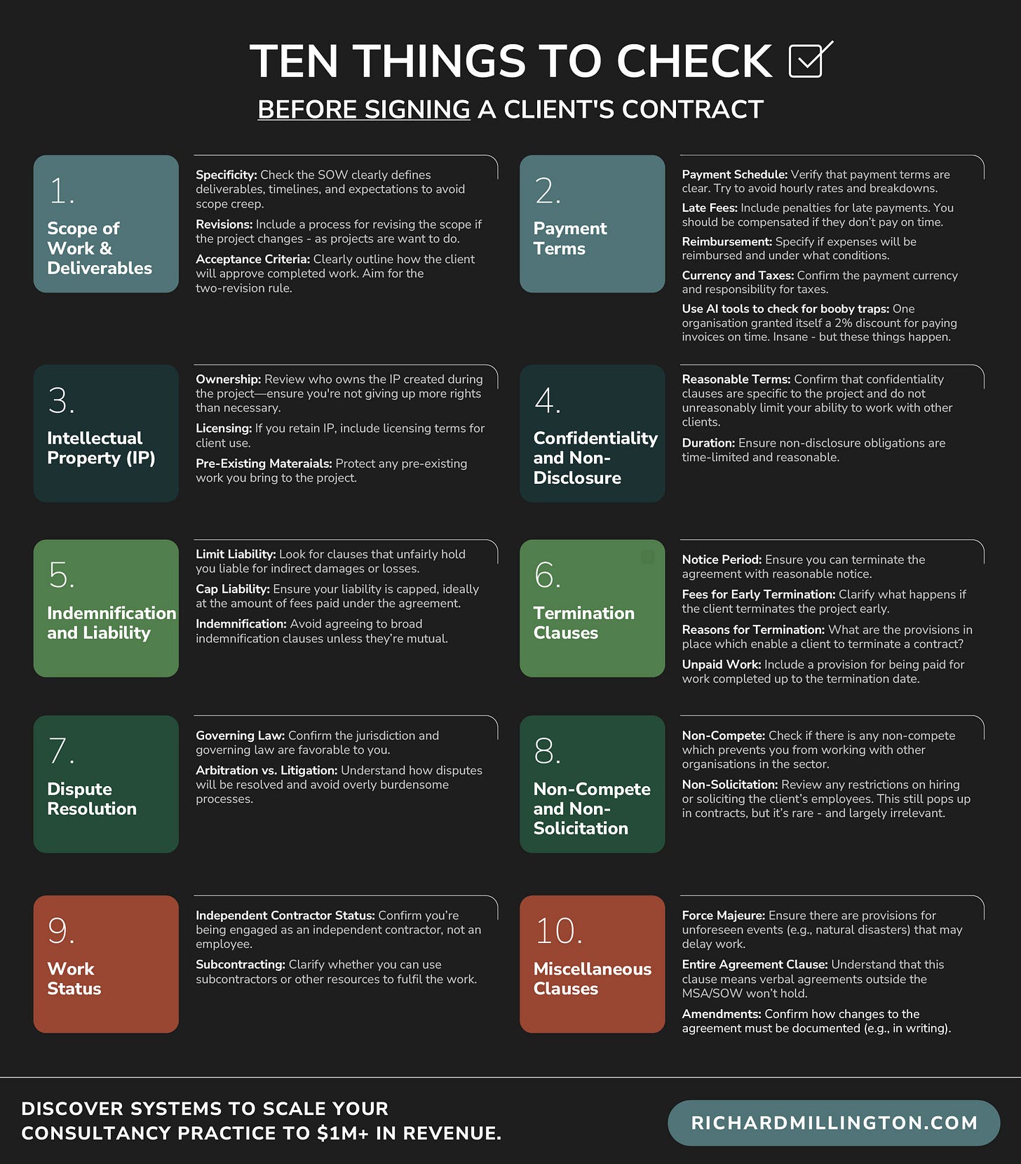 Non-Solicitation: Review any restrictions on hiring or soliciting the client’s employees. This still pops up in contracts, but it’s rare - and largely irrelevant.