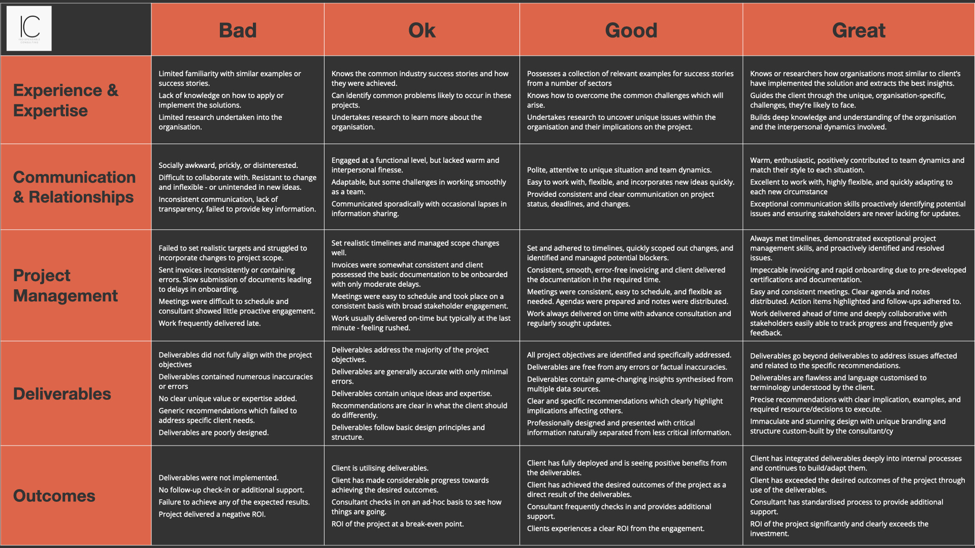 Personality. This is essentially whether the consultant was a warm, friendly, upbeat person who improved the team dynamics or not. Consultants who are cold, prickly, and irritable obviously aren’t the people you want to be consulting with.