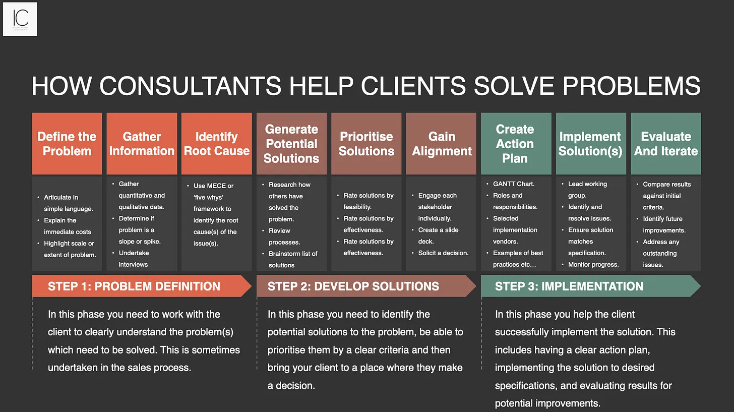 Clients want results, not knowledge. Consulting is about helping clients achieve something they couldn't do alone. This might include: