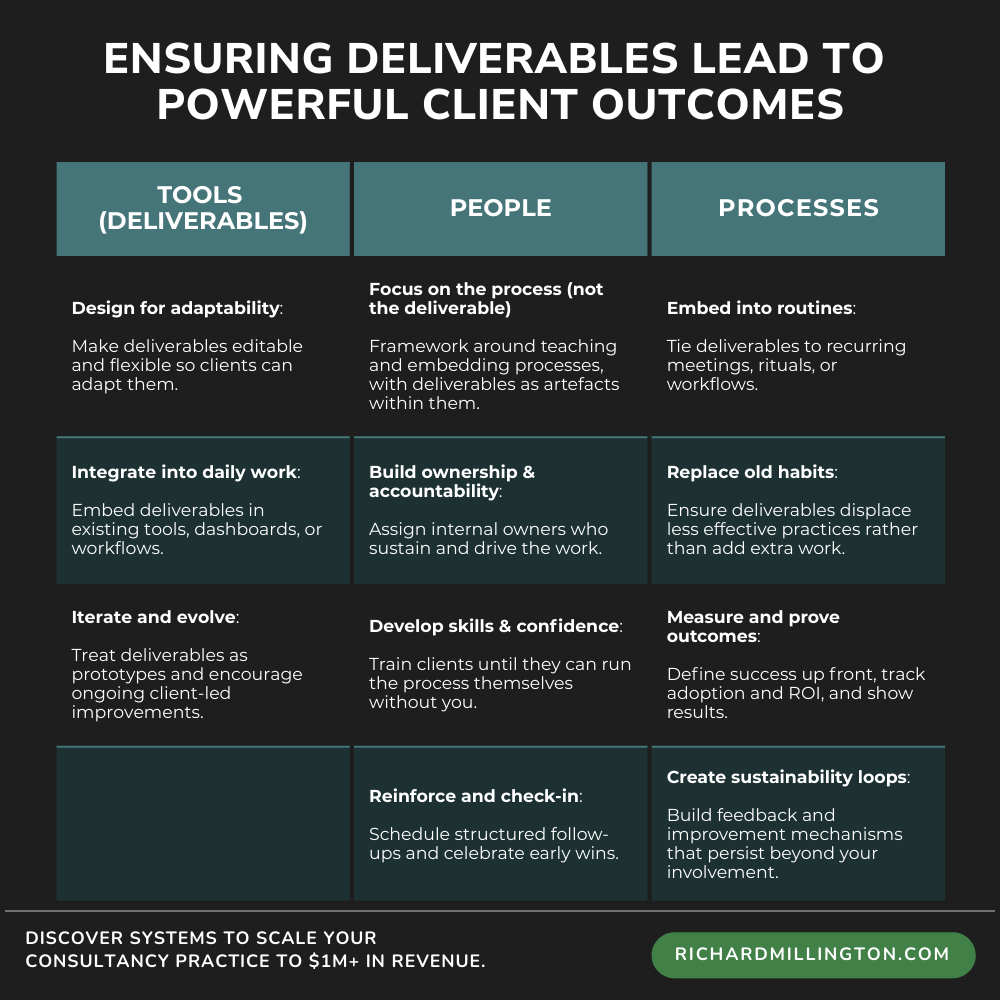 Not every deliverable is suitable for every problem, but the critical thing is you have some idea of what tools you need to create to help your clients solve the problems they face.