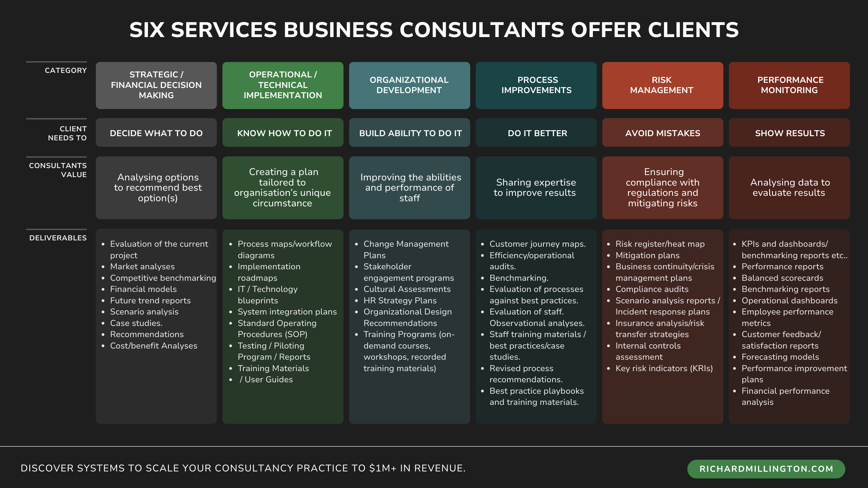 This probably isn’t a comprehensive list, but for most B2B consultants, most clients will fall into one or more of these areas.