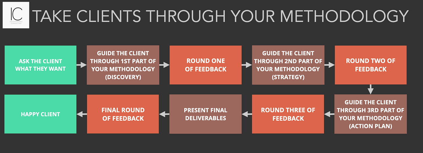If you don’t have a methodology to guide clients through, you’re always going to wind up simply asking clients what they think should be in the deliverables and then giving them exactly that.