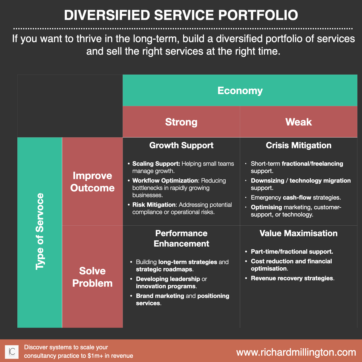 A sustainable consultancy acts more like a business than a freelancer. It builds a flexible service portfolio that adapts to market conditions, offering different solutions based on whether the client wants to grow or survive. You must recognise shifting market signals and actively promote the right mix of services accordingly.