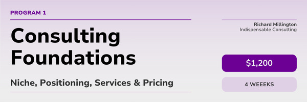 Together, these three programs take you from clarity, to consistent clients, to a consultancy that operates as a system rather than a series of heroic efforts. Each program builds on the last, removing the need to constantly re-decide what to focus on next.