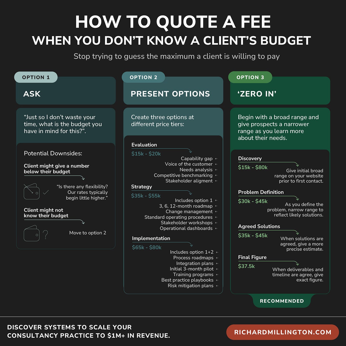The downside is that you still don’t know whether any of the options are within the client’s budget (and you might still be ‘leaving money on the table’).