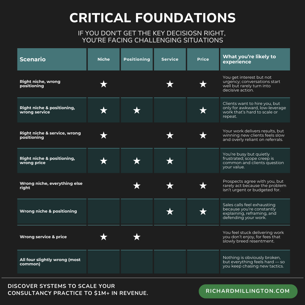 Reminder: You have two weeks remaining to enrol in my Consulting Foundations program. This program will ensure you’ve made the four key decisions correctly. This includes selecting the right niche, establishing the right positioning, designing the right services, and pricing yourself appropriately.
