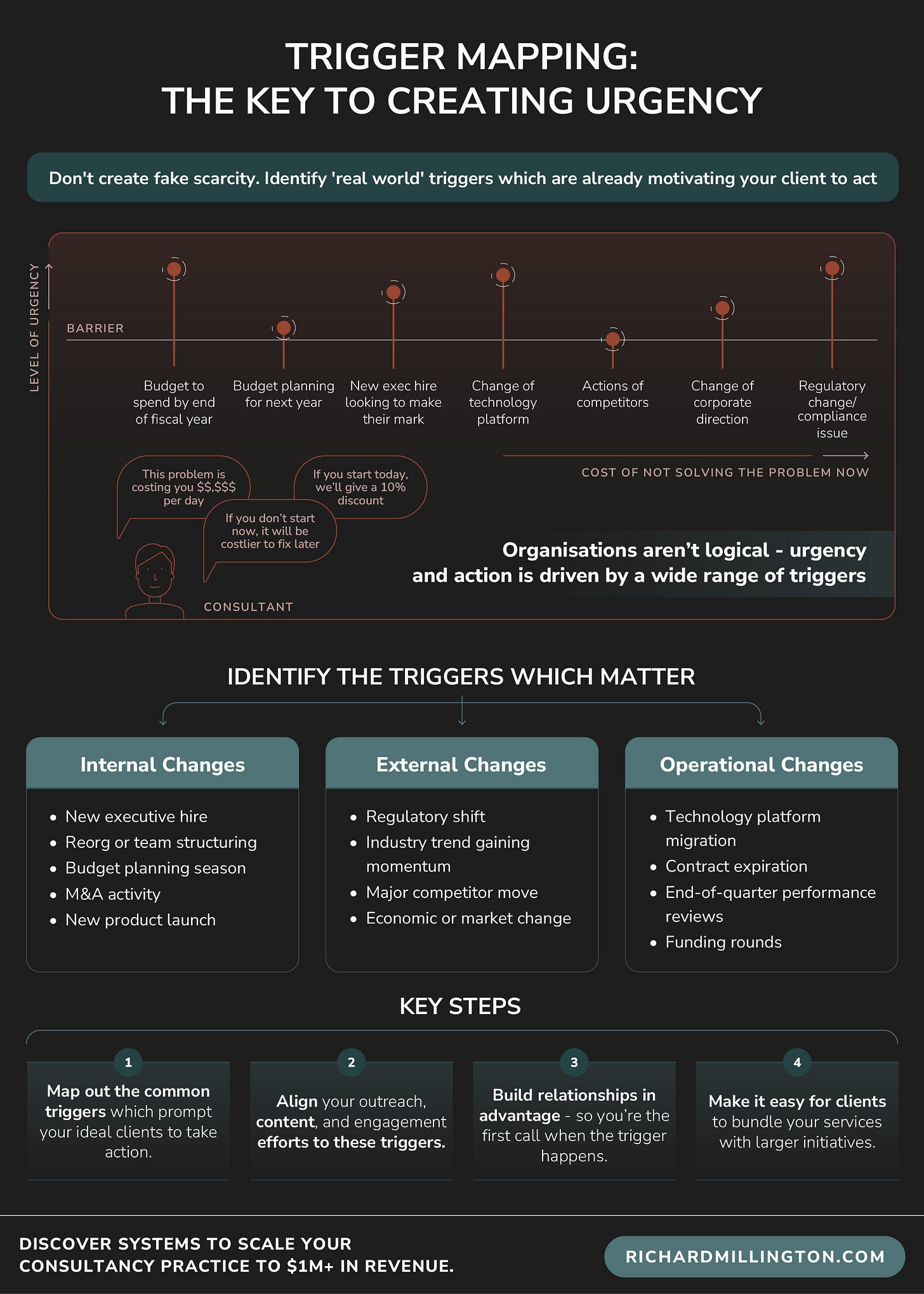 Rather than relying on persuasive tricks to create urgency, embed your work within real-world triggers that already motivate your clients to act.