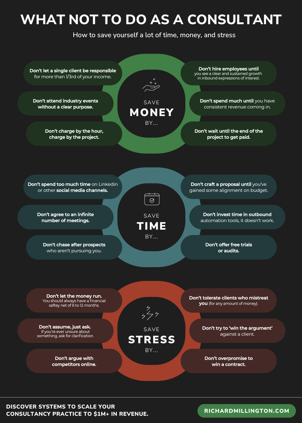 Don’t let the money run out. You should always have a financial safety net of 6 to 12 months. Anything less will cause significant stress. Take side hustles or cut costs if you need to, but it’s 100% easier to attract and retain clients when you’re not desperate. Desperation often leads to worse outcomes, such as cutting fees to win projects, appearing too desperate in the sales process, accepting clients who aren’t a good fit, or agreeing to unfavourable terms.